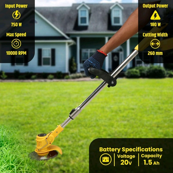 Designed for home gardens, farms, plots, and boundary areas, this cordless trimmer handles grass, weeds, bushes, and thick growth with ease.