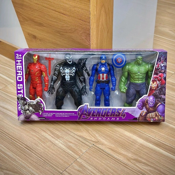 Description: Bring epic battles to life with this 4-piece superhero action figure set! Featuring fan-favorite characters inspired by legendary heroes – Iron Hero, Venom, Captain, and Hulk – this set delivers hours of imaginative fun. Each figure stands tall, made from durable plastic with detailed design and bold colors.