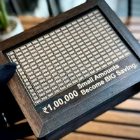 DIFFERENT STORAGE GOALS : The piggy bank offers a variety of saving goals to choose from, including options such as 500, 800, 1000, 2000, 3000, 4000, 5000 and 10,000 Rupees India. Additionally, there are two customizable cards provided where you can mark your desired savings amount for a personalized financial goal.